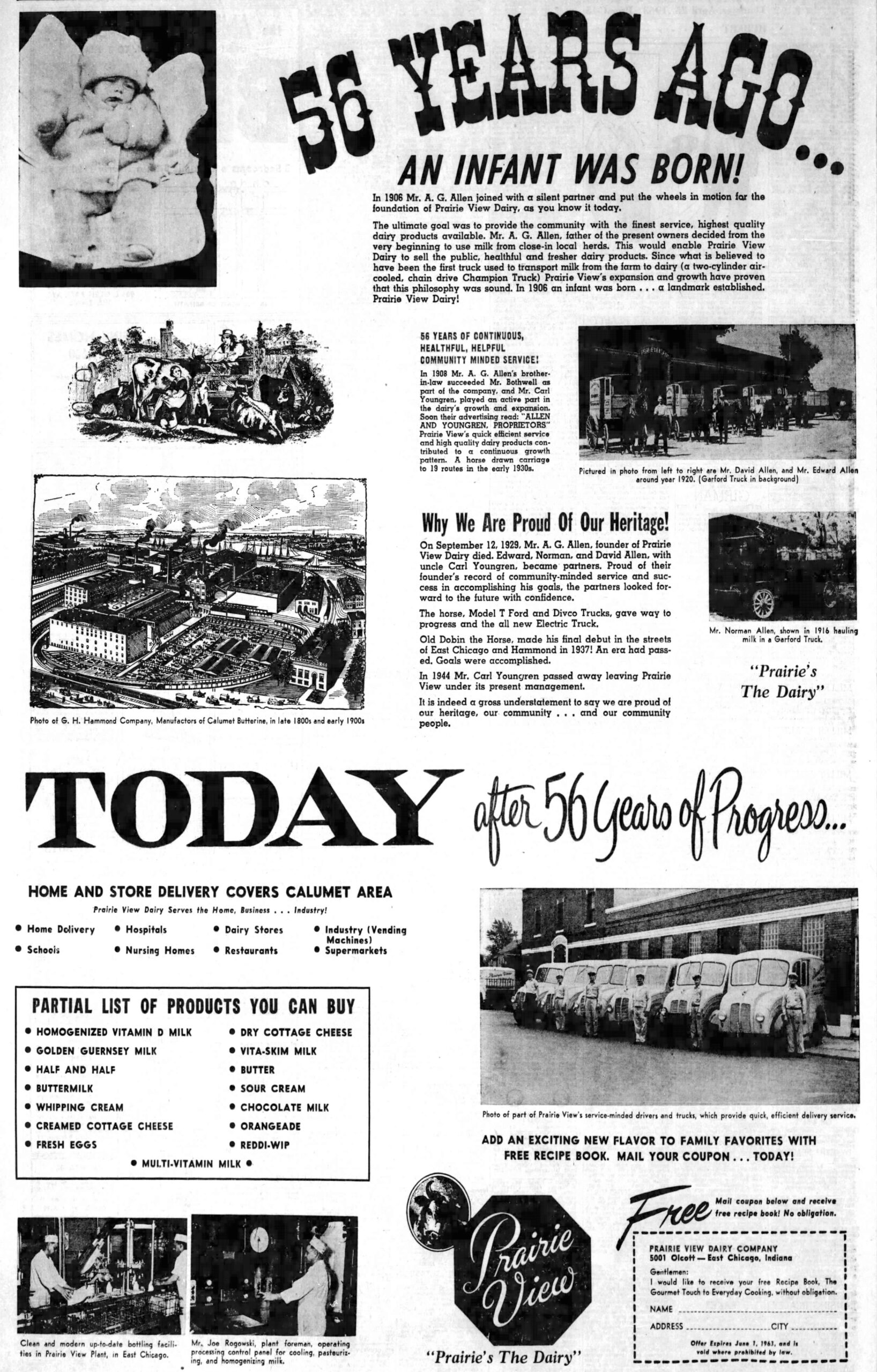 According to an article published in The Times on February 16, 1937, Anders G. Allen and Charles Bothwell started the Prairie View Dairy Company in 1906. In 1907, Carl Youngren bought Bothwell’s interest in the business. The dairy originally operated out of the basement of Allen’s home at 5005 Olcott Ave. That’s how the A&Y name was formed.
