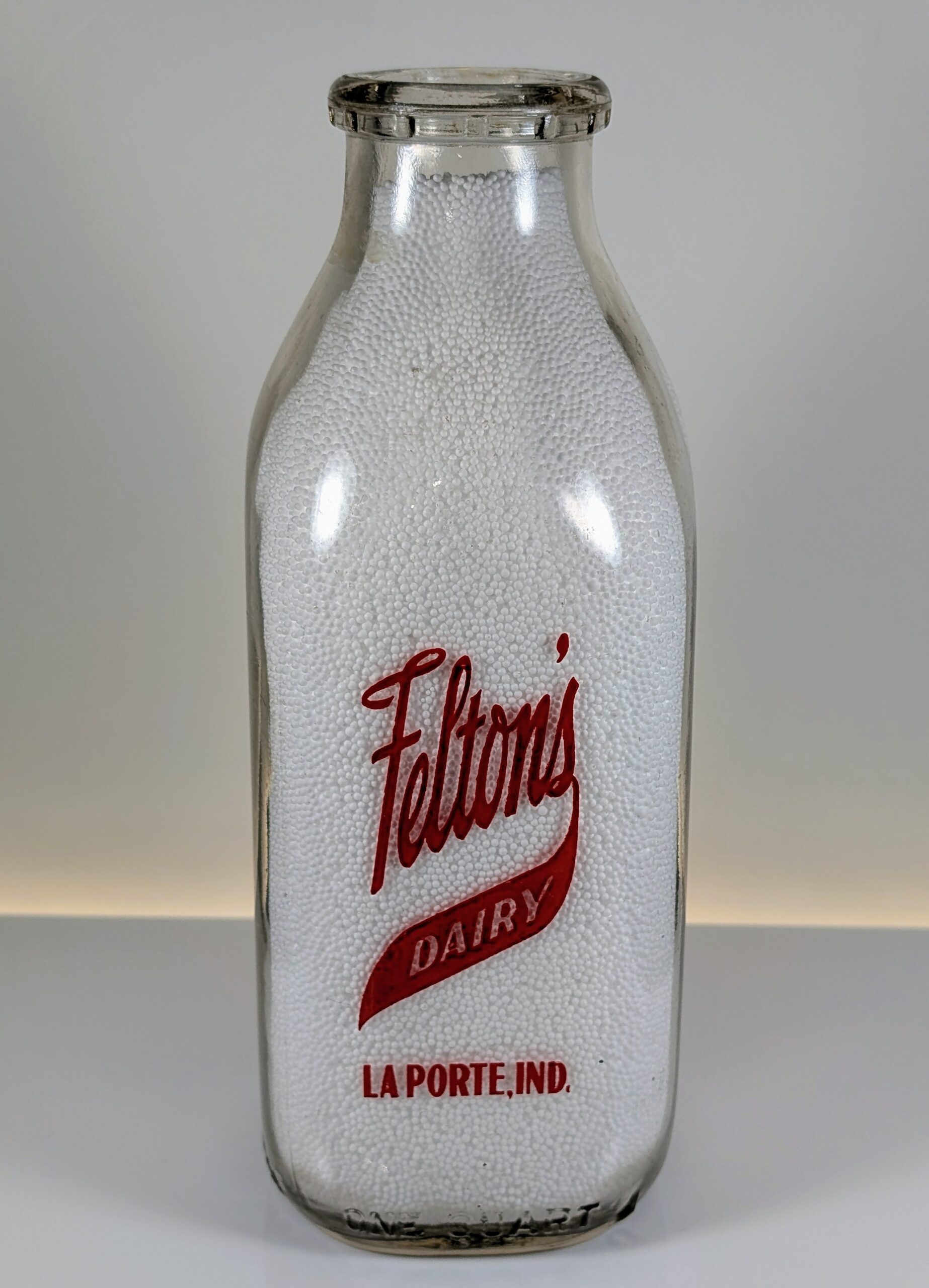 Pyroglaze / ACL: Red pyroglaze lettering reading Felton’s / DAIRY / LA PORTE, IND.