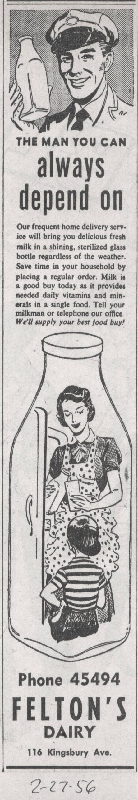 1952 — Felton’s Dairy (Walter P, James E and Leland C Felton) 116 Kingsbury Av.