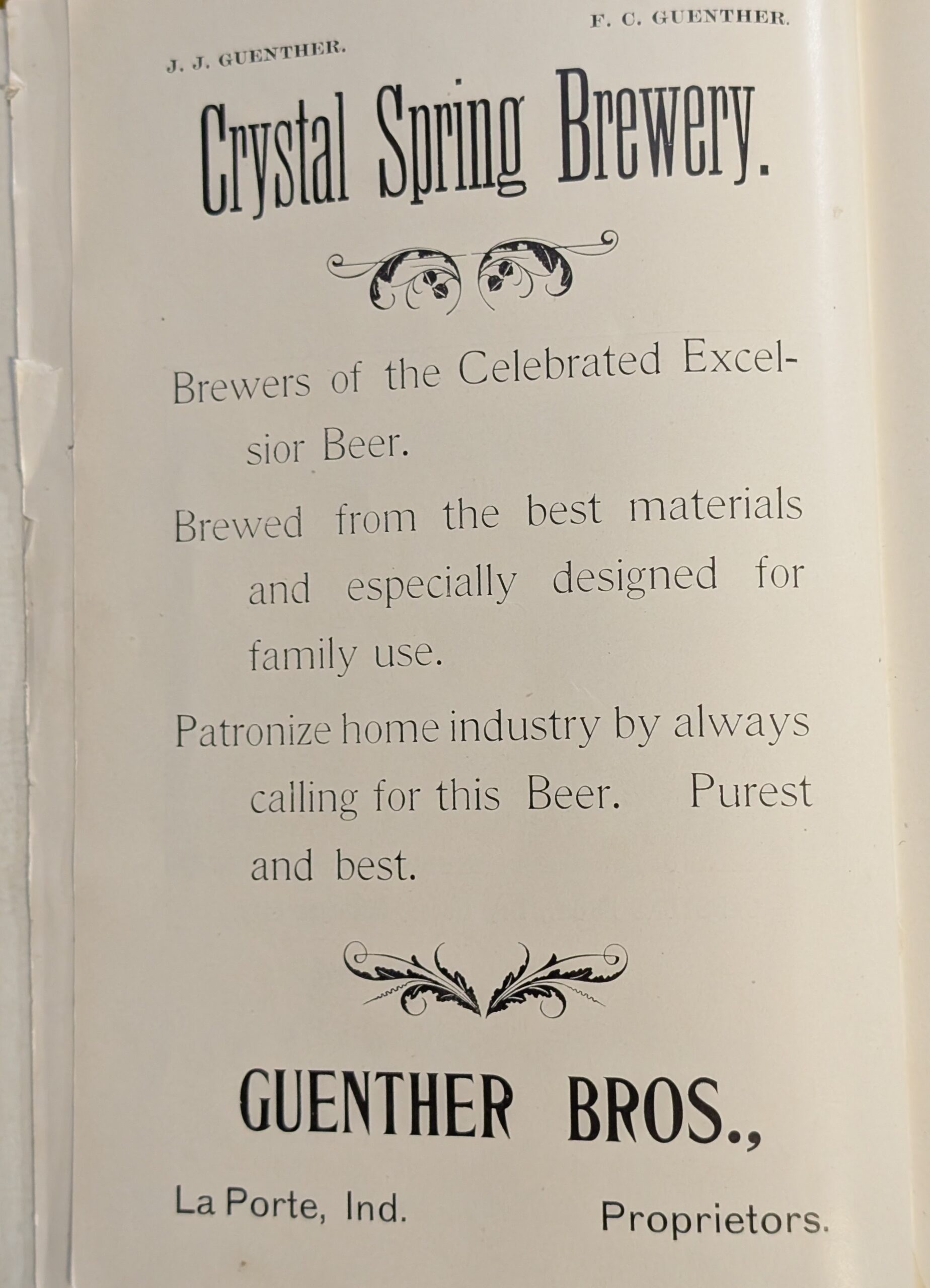 According to information from the La Porte County Historical Society, the Guenther brothers had prior brewing experience in Sacramento, California, and Massillon, Ohio. They expanded the brewery’s operations and, by 1905, had opened a sample room at 609 West Main Street. The brewery became known for producing brands such as Excelsior, Home Brew, and Indiana Gold.