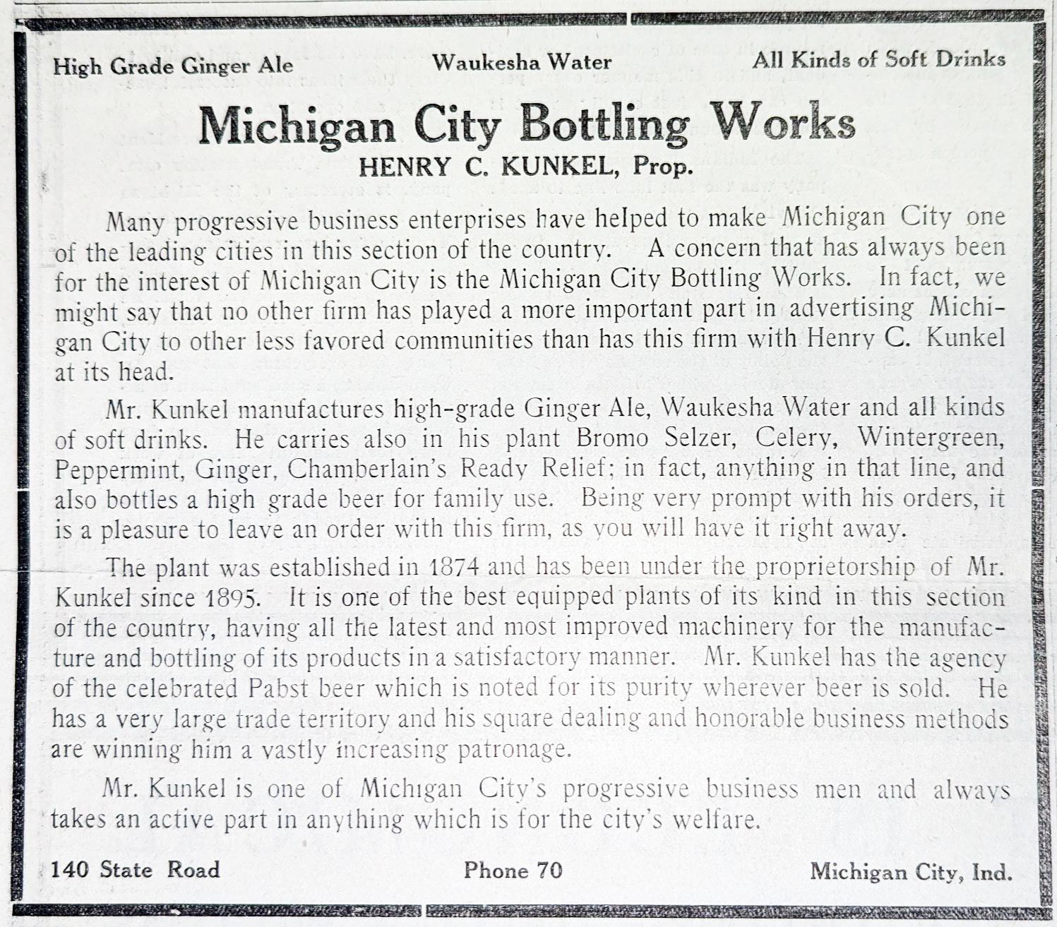 — Michigan City Bottling Works, H. C. Kunkel, proprietor, e Eighth, phone 70.