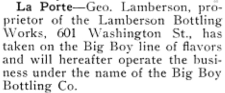 Lamberson took over the Jacob Spahn Bottling Works sometime shortly after 1910, operating at 601 Washington Street until the early 1930s. The June 1928 issue of The Beverage Journal reports that he began bottling for the Big Boy Bottling Co.