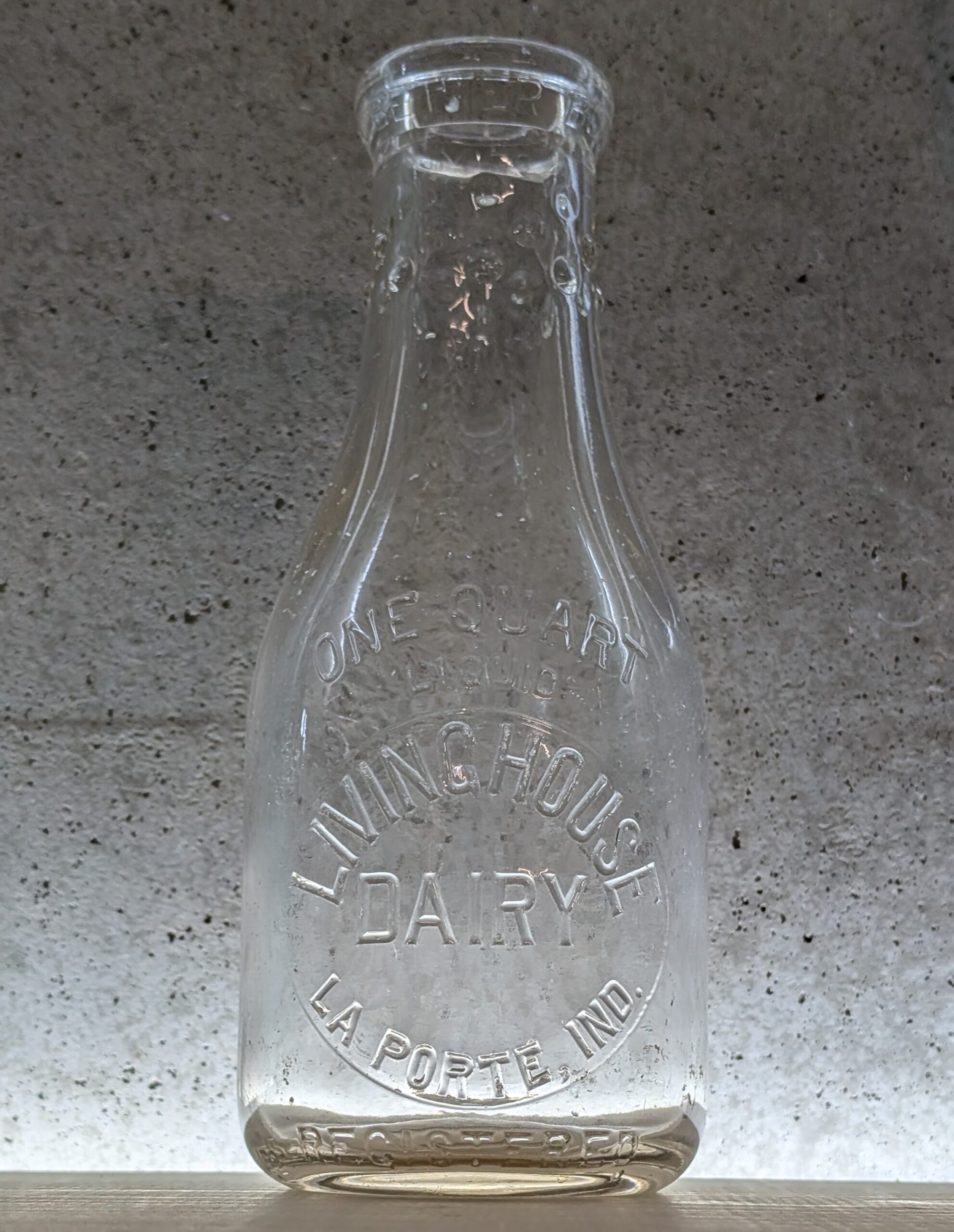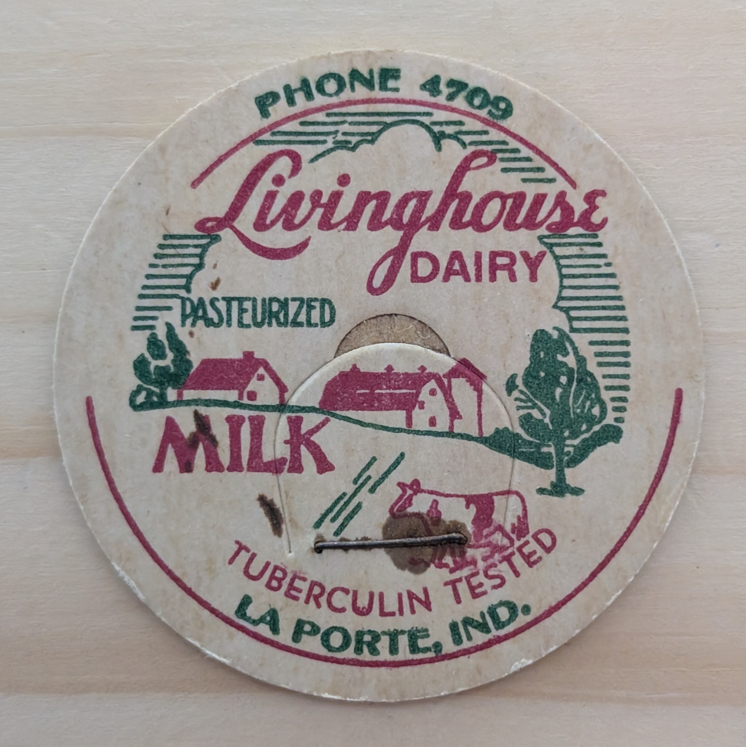 We believe the dairy was owned by Noah Ray Livinghouse (1893–1977). Noah is listed as a farmer in the 1930 and 1950 U.S. Census. He was the father of Ray E. Livinghouse (died 2011), whose last known address was 2658 E. U.S. Highway 20 in LaPorte, an area still known as Livinghouse Farms, located about a mile and a half from Rolling Prairie. If someone has access to LaPorte phone books from the 1930s, we may be able to narrow this history down further.