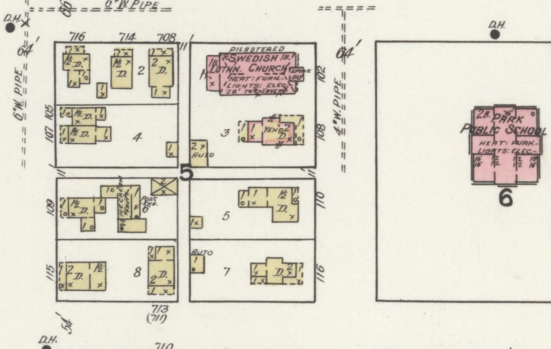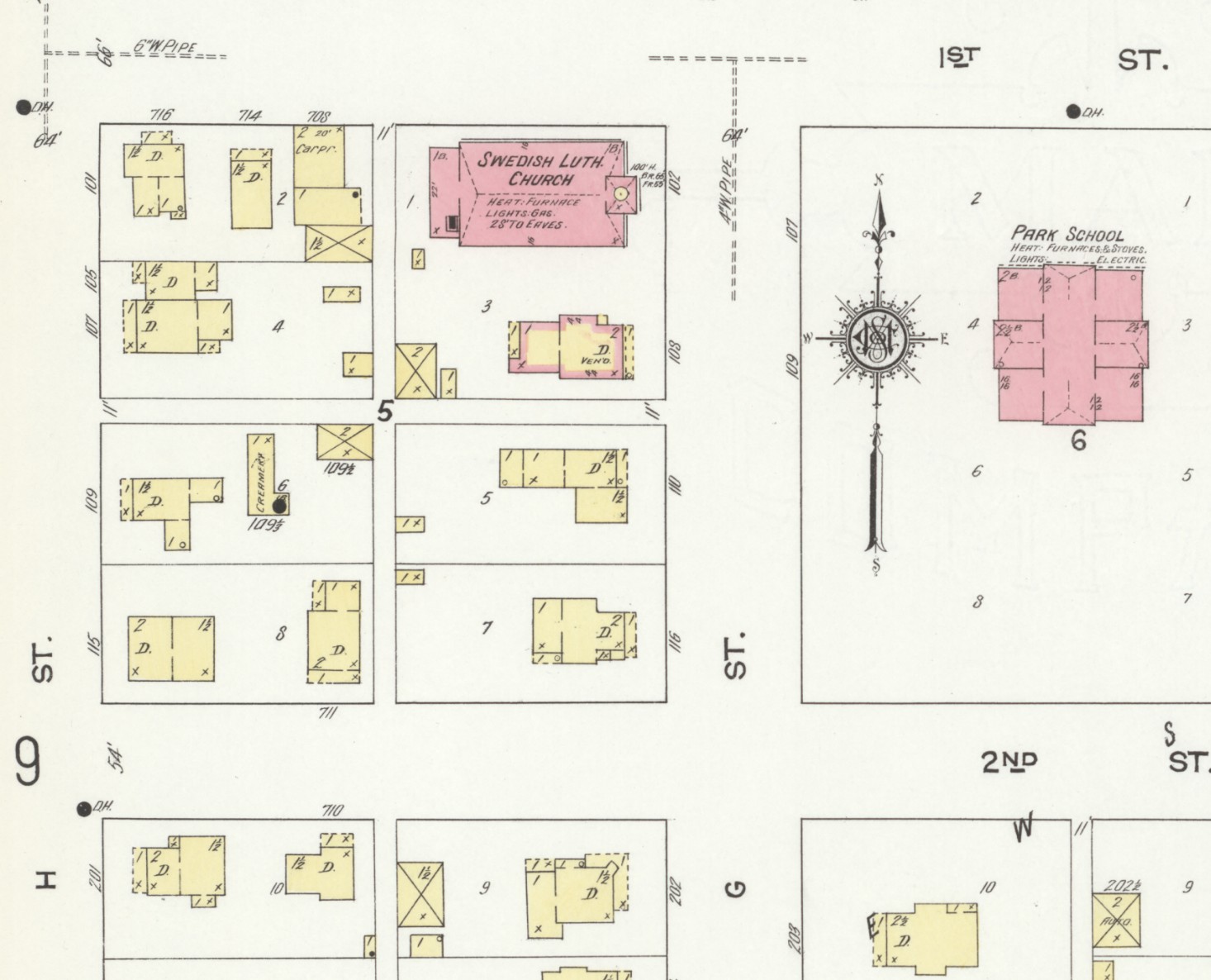 1912 Sanborn Fire Insurance Map. Note 109 H Street on the left side. The northern street at the top is 1st Street, and the southern street at the bottom is 2nd Street.